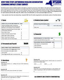 2026 Economic Impact Survey NYSADA surveys member dealers to gather information to prepare an Economic Impact Report thatt shows the significant economic impact the automobile industry has on the state of New York. NYSADA uses the report when dealing with the legislature, government agencies, and the media. Please take a few minutes to complete the survey and return it as soon as possible. Your response will be held in strict confidence.